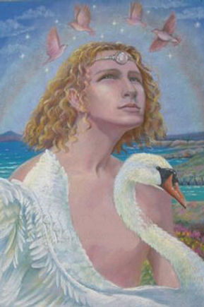 Óengus was conceived when the Dagda fell in love with Eithne, also called Boann, the goddess of the Boyne and wife of Elcmar of the Brug. (now known as Brugh na Boinne or Newgrange)The Dagda sent Elcmar on an errand to Bres, and in the meantime used his magic to make one day last nine months. At the end of this time, Óengus was born. The Dagda then brought Óengus to Midir to be raised as a fosterson for nine years. As a child, he is insulted by a Fir Bolg boy he's playing with for not having any parents; Óengus inquires to Midir how this is, and learns that he is the Dagda's son1. Óengus demands a home, and the Dagda helps him trick Elcmar out of the Brug, who is then given Cleitech instead. (https://www.maryjones.us/jce/oengus.html)